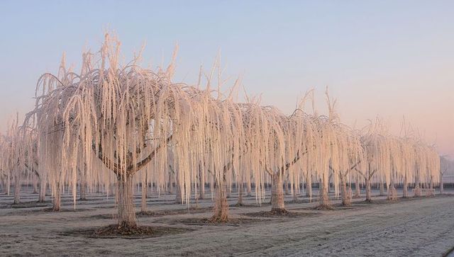 Frosted weeping willows draping orchard with hoarfrost at pastel dawn winter sunrise