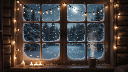 Cozy winter evening scene viewed through a rustic window adorned with glowing string lights and snow covered sill