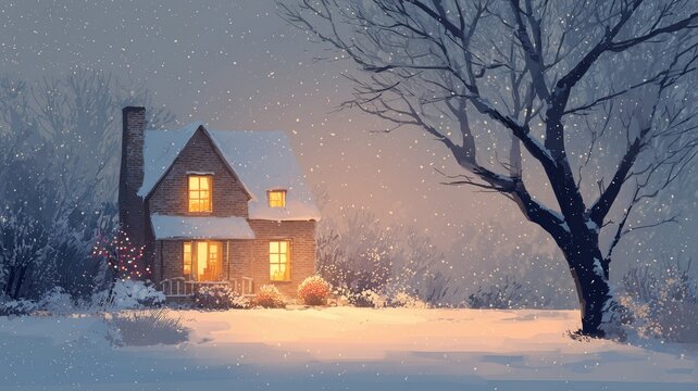 Snowy fairytale cottage with glowing windows and festive lights, surrounded by sparkling snow, holiday decorations, winter trees, and peaceful garden at dusk