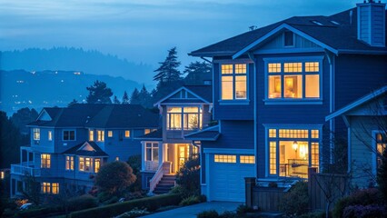 Luxury suburban homes with warm glowing windows in a hillside neighborhood at twilight.