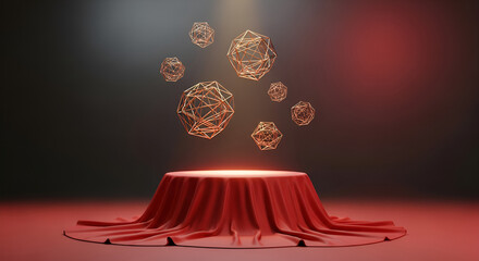 Luxurious Red Podium Stage with Floating Geometric Orbs
