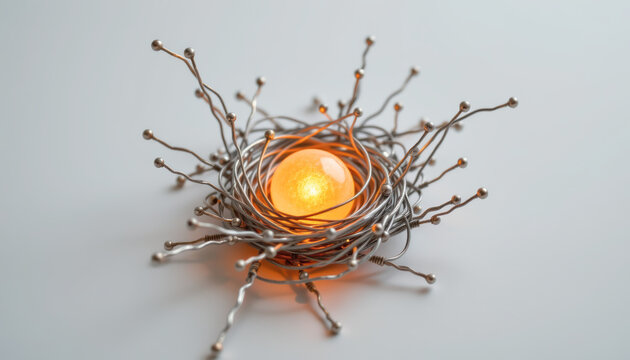 Fractured metal orb revealing glowing blue core and molten sparks amid tangled cables