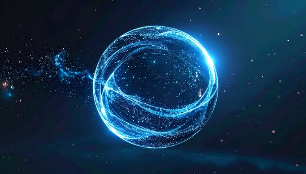 A futuristic digital illustration of a glowing blue sphere with geometric patterns