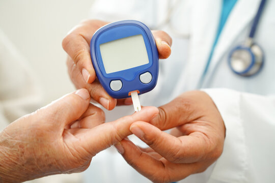 Doctor checking blood sugar level with glucometer