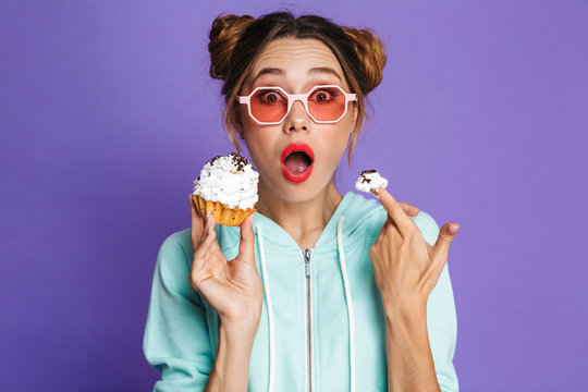 Happy celebrating sweet tooth man bites baked pancakes with cream, eats all desserts by himself, doesnt prevent from obesity, makes wrong nutrition choice, greedily devours bakery production