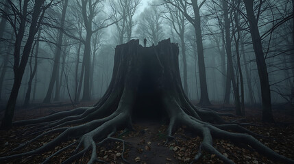 Ancient tree with sprawling root system, organic, foliage,  organic, foliage, gnarled trunk