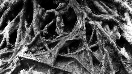 Close-up of gnarled tree roots emerging from dark soil, bathed in warm sunlight