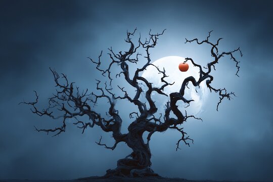 Creepy Halloween illustration with gnarled tree branches framing a skull, perfect for spooky designs, posters, and seasonal projects