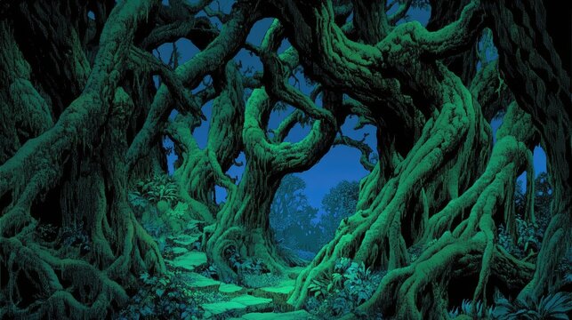 A winding path through a misty forest of ancient, gnarled trees in autumn.