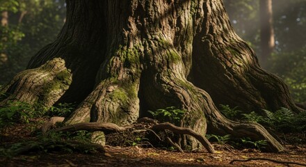 Close-up of gnarled tree trunk wrapped in twining vines with heart-shaped green leaves in a serene forest setting