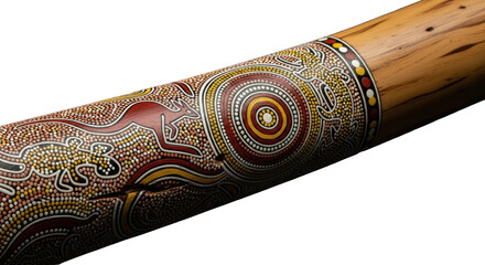 Aboriginal instrument featuring kangaroo, goanna and concentric circle artwork on a dark backdrop