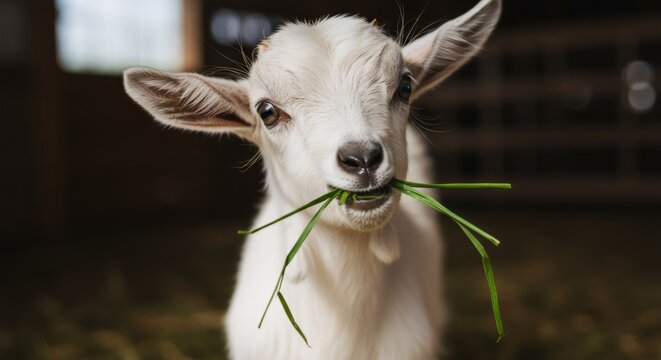 Cute white baby goat chewing on grass in barn. Close-up portrait of young kid with big ears. Farm animal, livestock, and sustainable agriculture concept. Pet and rural life.