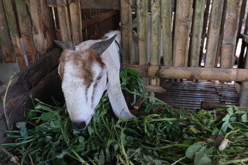 Close up view of goat domestic animal eating food at farmhouse.