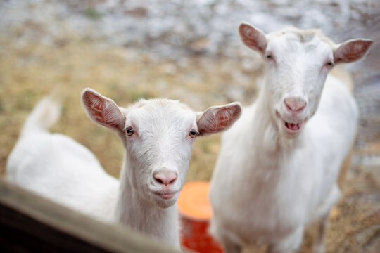 Close up of domestic goats in barn shed