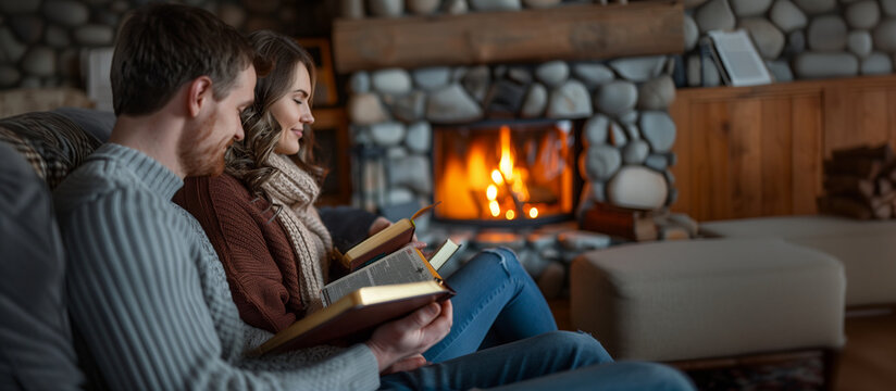 a close-up image of a man and woman praying together with Bibles in hand, sitting by a fireplace, Backgrounds, People, Praying, Heaven, Religion, Bible, with copy space