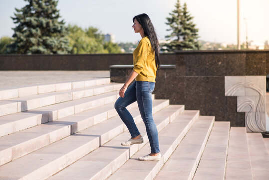 Top view of smart business man walking up stairs with bag in the hand. Professional project manager climb up the stair and going to workplace. Increasing skill, getting promotion, traveling. Exultant.