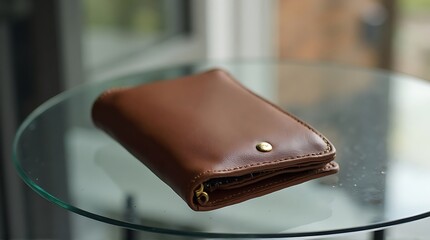 A brown leather purse with a gold button on the top. The leather is of high quality and has a rich, warm tone