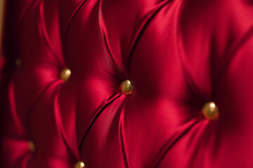 Wall decor. Background. Wall covered with quilted red satin fabrics and gold button