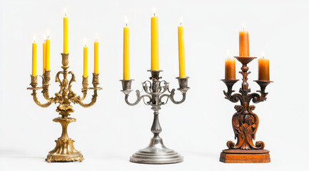 Three unique candelabras each with three elegant candles on display