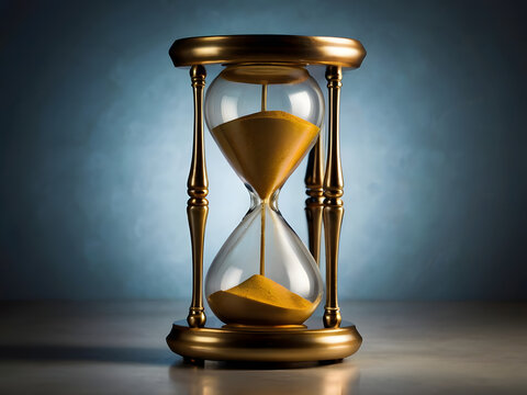 Gold hourglass with red sand against teal backdrop