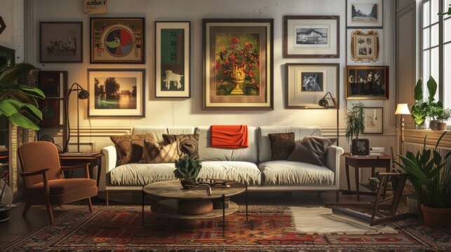 Warmlylit living room with vintage decor, framed pictures, and stylish decor