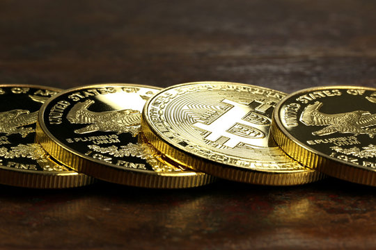 Bitcoin in a row of 1 ounce American gold eagle bullion coins