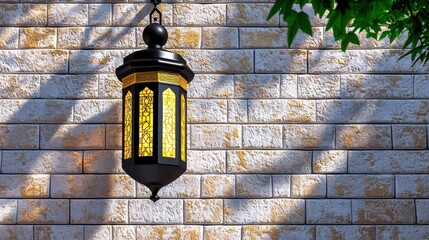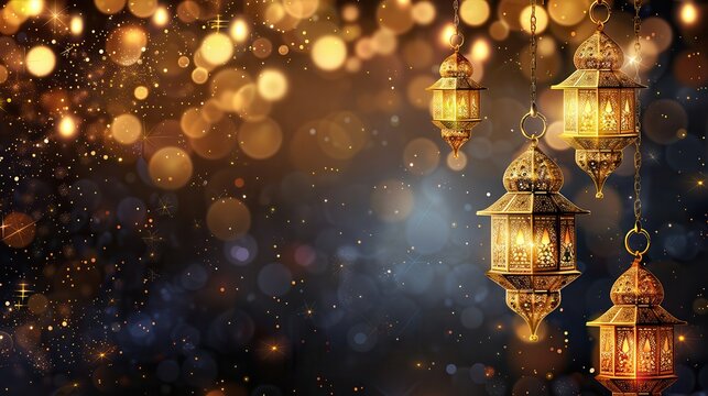 Festive gold lantern glows, bokeh background, Ramadan greeting