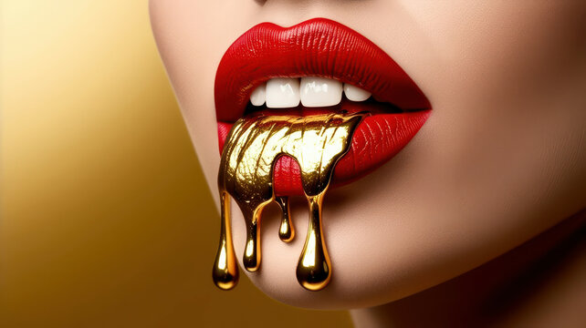 Close up of a beautiful, young, black woman's lips with golden, liquid make up dripping down her lips.