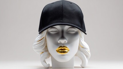 Minimalist white bust sculpture with black baseball cap and gold lips on neutral background
