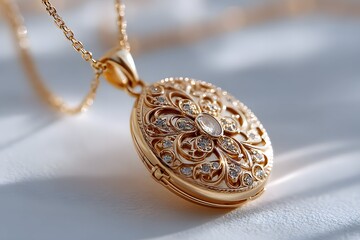 Close-up of antique gold locket, intricate detailing, aged patina, jewelry, retro