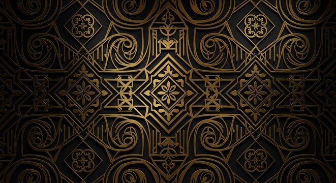Art Deco-inspired black and gold pattern with radiating fan motifs inside intersecting diamond shapes.