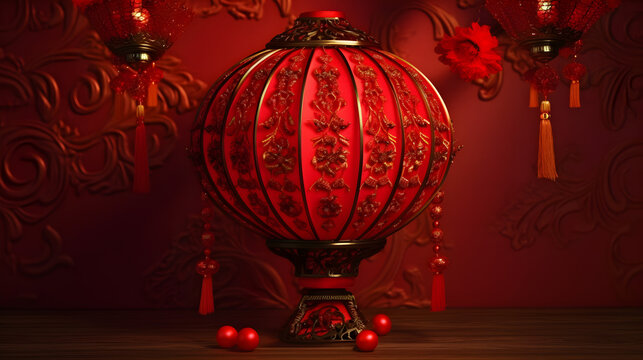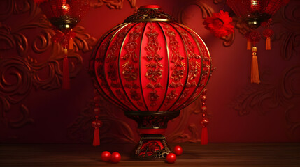 A traditional Chinese lantern with intricate red and gold patterns, hanging on a wooden table against a red and gold background with floral decorations.