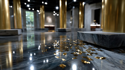 An elegant interior featuring shiny gold pillars, polished floors, and artistic lighting, creating a luxurious and sophisticated atmosphere suitable for high-end events.