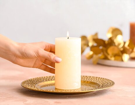 Hand holding a lit candle on a gold plate