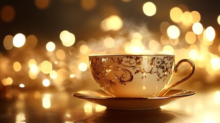 Sparkling teacup in warm evening with elegant gold scrollwork