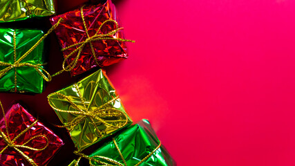 A shiny green, red, and gold wrapped gift boxes with gold strings sits against a red background. Christmas, holiday celebrations or sales events. Copy space for text.