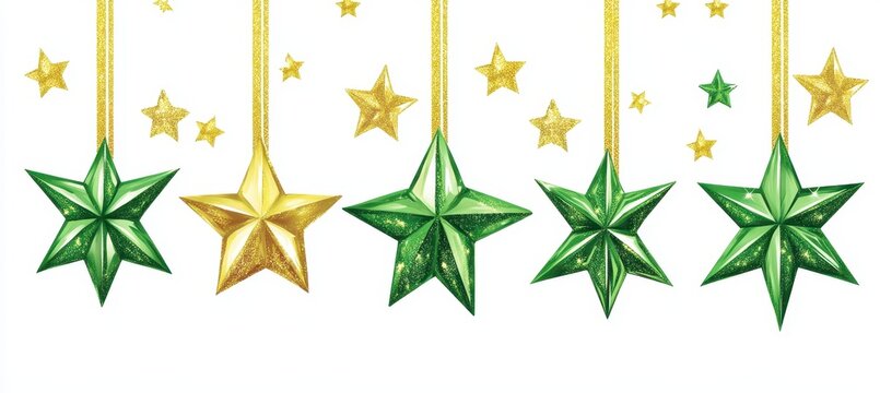 Golden and green star ornaments hang from gold strings against a white background, with smaller stars scattered around