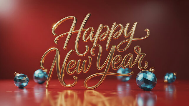Golden Happy New Year Text with Blue Ornaments on Red Background gold text reflective surface