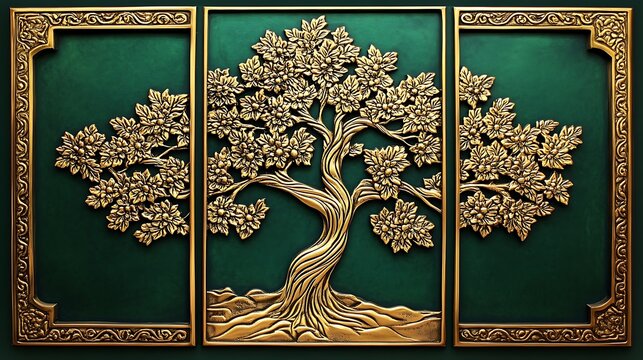 Triptych of gold tree relief art on green background.