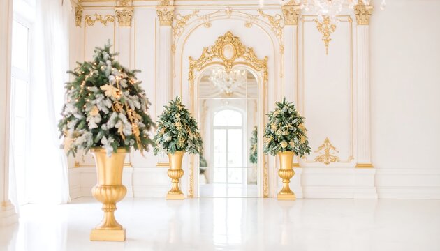 Ornate room with three decorated Christmas trees in gold urns