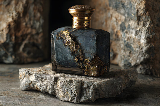 Luxury perfume bottle on marble base with golden backdrop