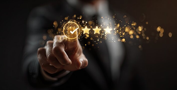 Hand holding a checkmark badge with golden stars floating above it in a dark blue background