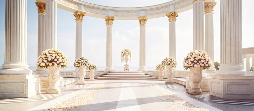 a golden yellow ancient greece and roman empire texture wallpaper background with a lot of empty blank copyspace. pillars and old buildings.