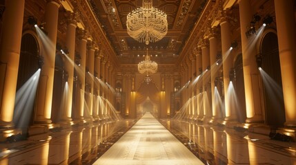 A long white runway stretches through a grand hall, illuminated by spotlights and lined with golden pillars. Chandeliers hang above, adding to the opulent atmosphere.