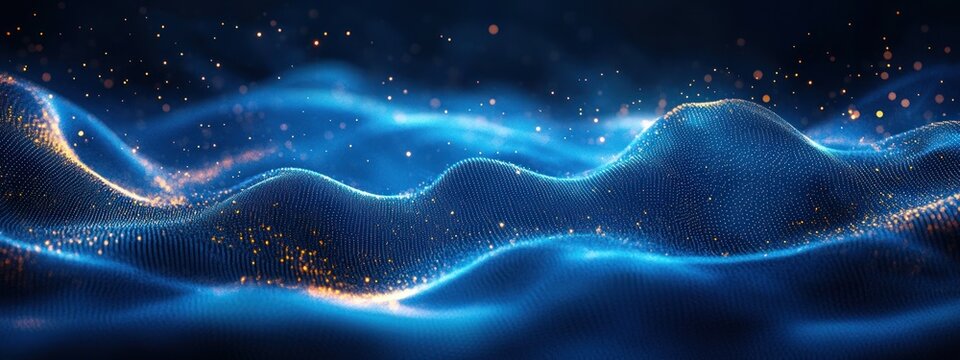 Undulating blue digital mesh waves dotted with golden particles and glowing highlights, a serene futuristic sparkling data landscape