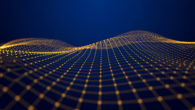 Abstract Digital Network Waveform, Glowing Golden Grid on Deep Blue Background, Futuristic Technology Concept