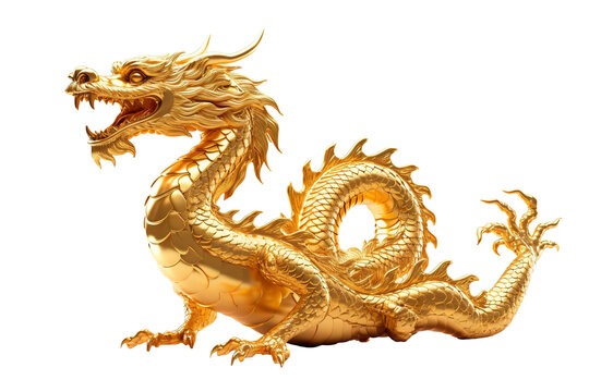 Golden dragon statue on white background.