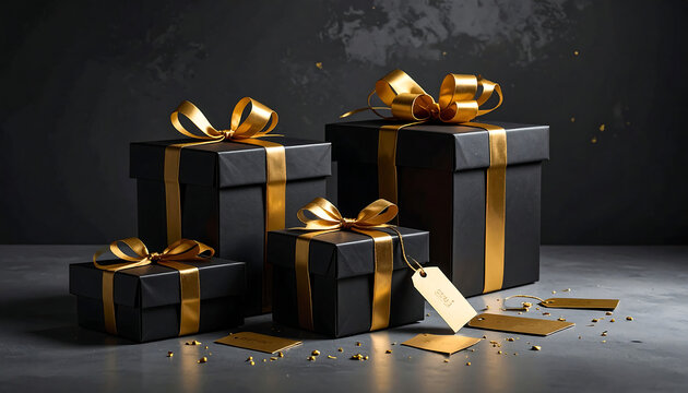Luxurious black gift boxes with golden ribbons on a dark background for special occasions