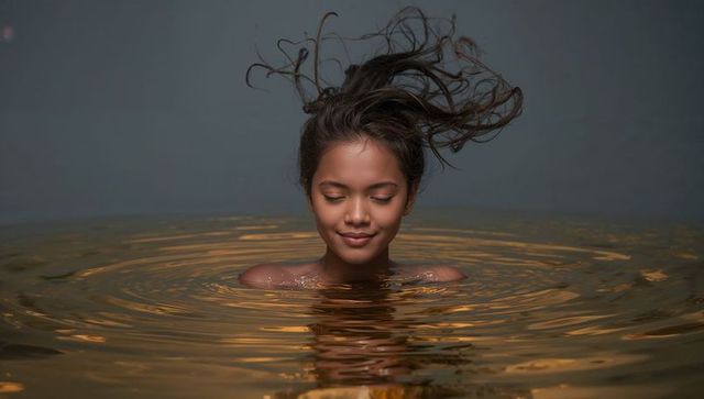 Floating woman lifting wet hair in studio pool with golden ripples and serene expression