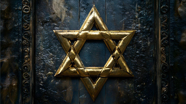Luminous golden Star of David on a dark background, symbolizing Judaism and faith.